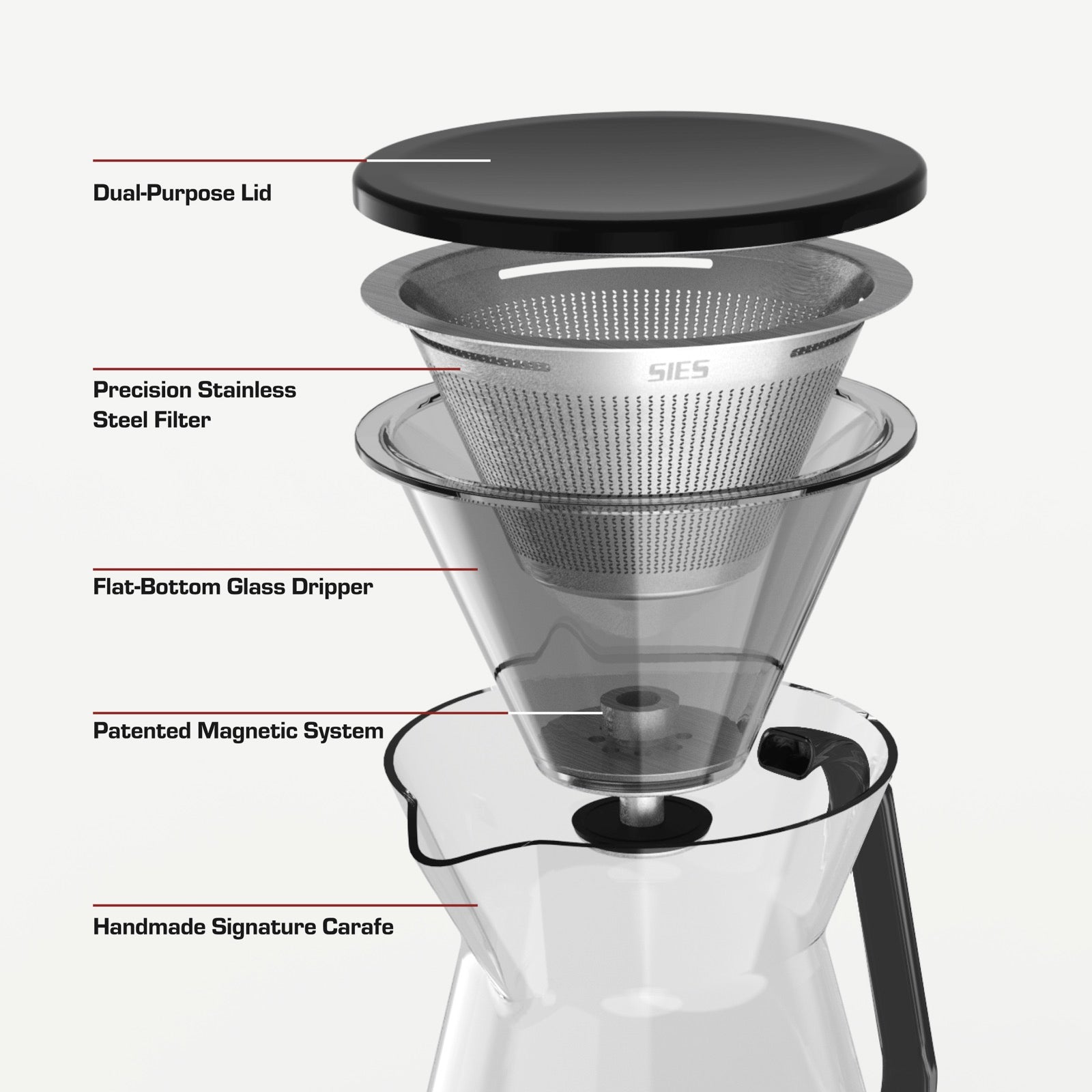 The Volarr Brewer is thoughtfully designed for a better brewing experience, with a dripper holder, a clear brewing system to showcase your brew’s color, and a coaster to protect your surfaces.