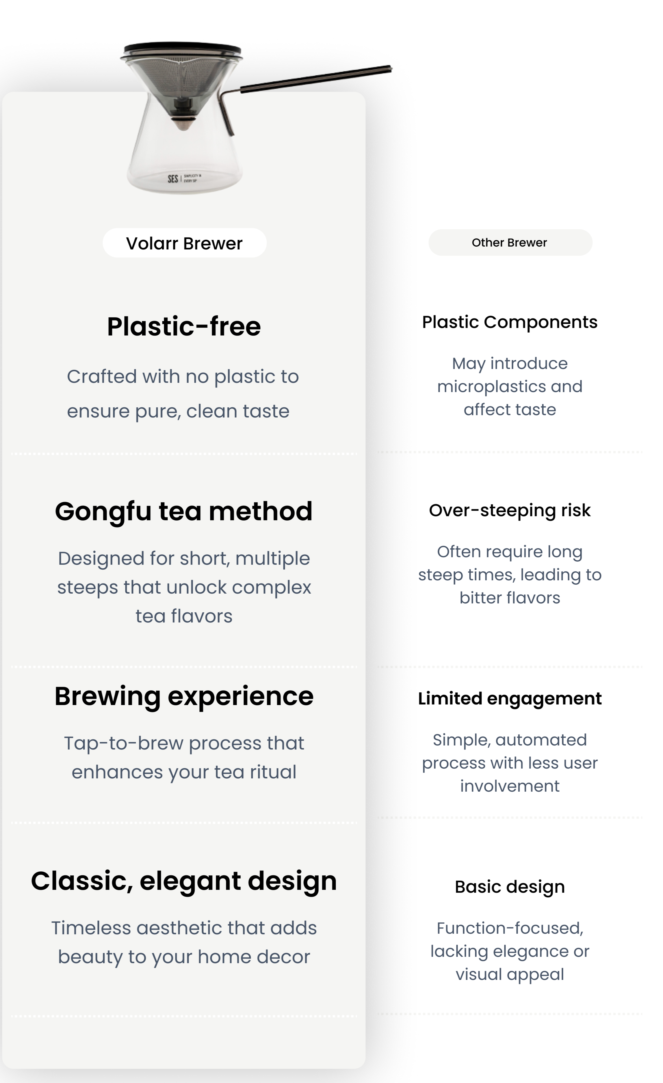 "Imagine combining the rich flavor of traditional Gongfu tea with the ease and functionality of a coffee pour-over" β that's the idea behind the Volarr Collection. Gongfu-style brewing offers unmatched depth and complexity, so we kept the best parts and created a modern version.